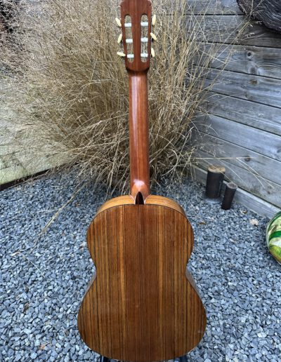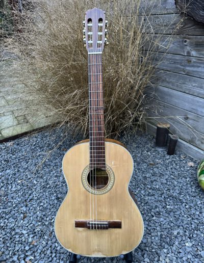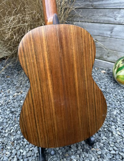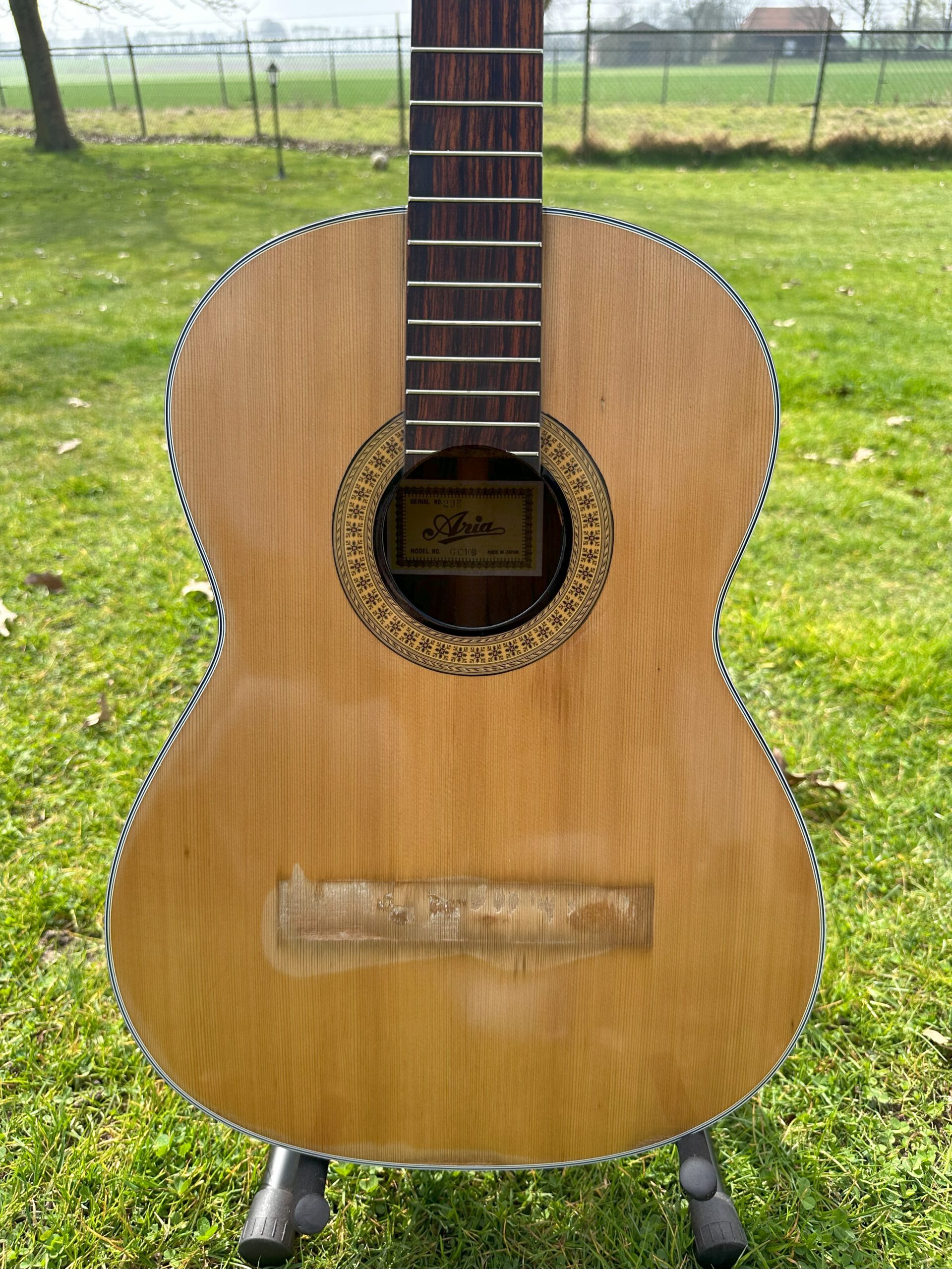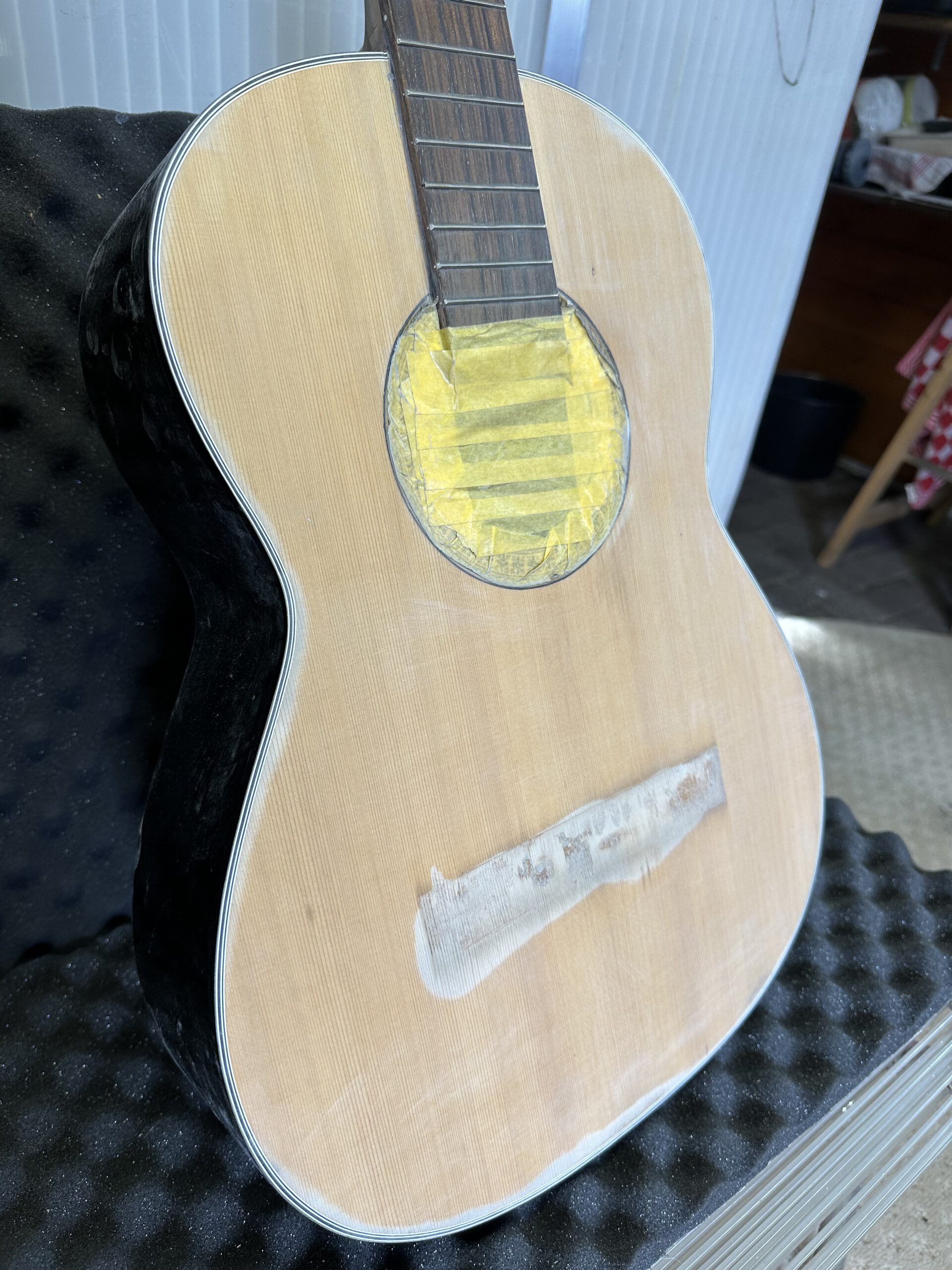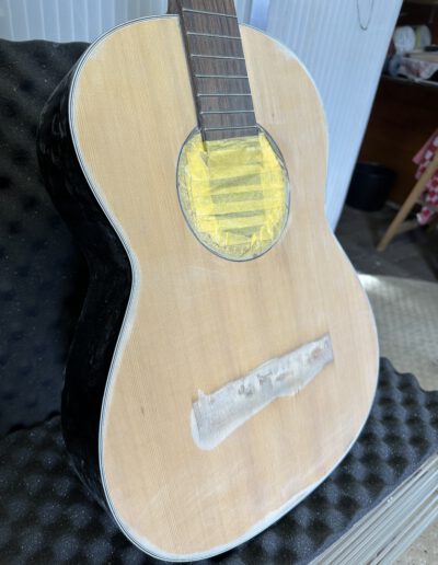 De bridge van de classic Aria moest opnieuw vastgezet worden maar eerst moest de niet-originele zwarte lak verwijderd worden. Veel schuurwerk dus en daarna spuiten met blanke lak, polish en wax.