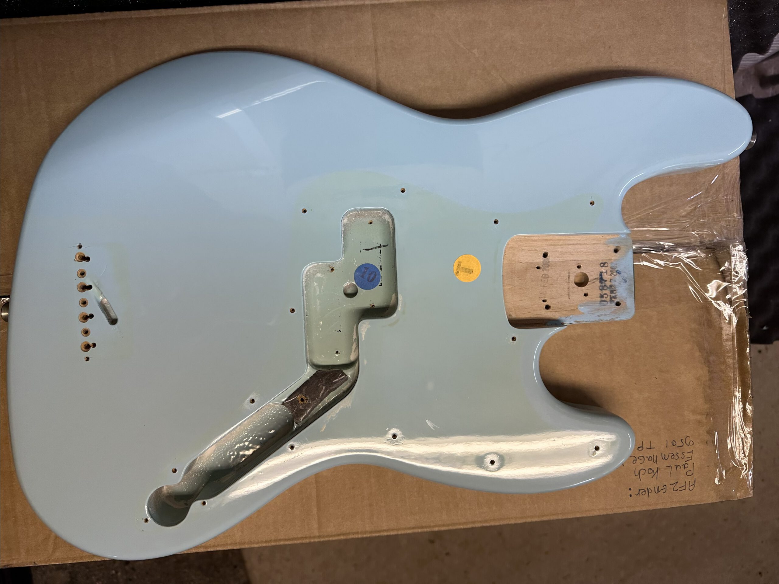 Deze Fender Mark Hoppus Bass body wordt opnieuw gespoten in de kleur Pearl Pink. Deze speciale lak is afkomstig van Stardust.
